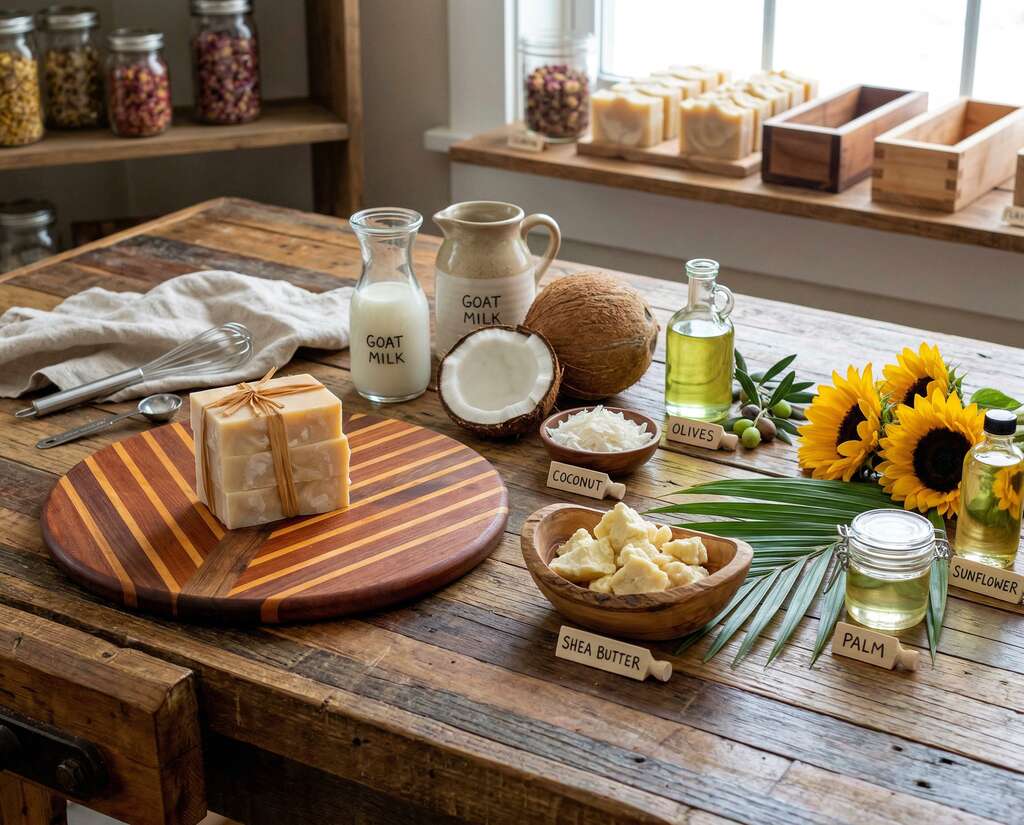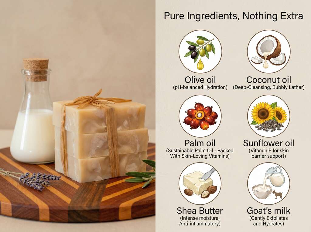Goat Milk, Coconut Oil, Olive Oil, Shea Butter, Palm Oil, Sunflower Oil